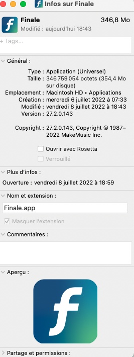 Finale 26.3.1 peut tourner sous Monterery, mais pour les Mac équipés du processeur M1, il faut lancer Finale en mode Rosetta. Cela se fait via la fenêtre Lire les informations de l'icône de l'application Finale 26.