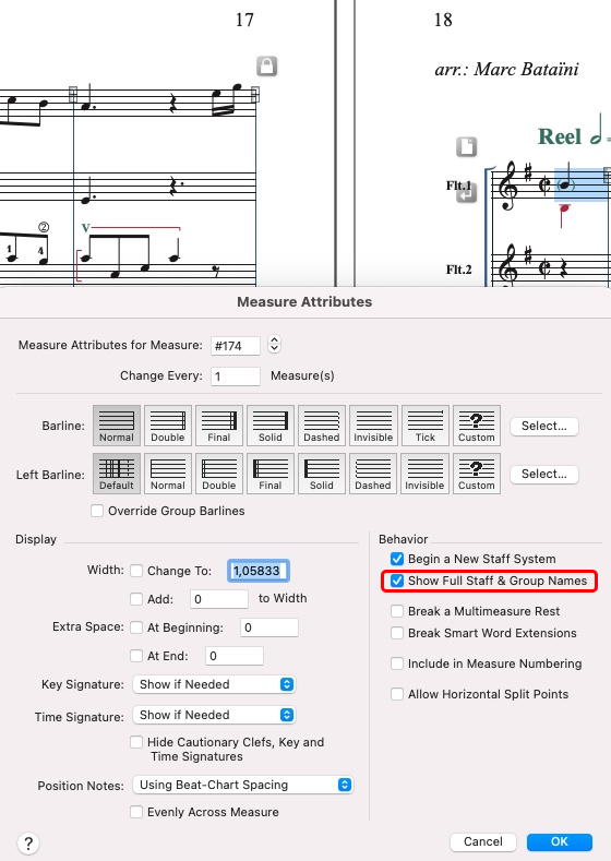 Il y a juste une case à cocher, après avoir sélectionné la première mesure (page 18). En français, ça doit être un truc du genre : Afficher le nom complet des portées et des groupes.