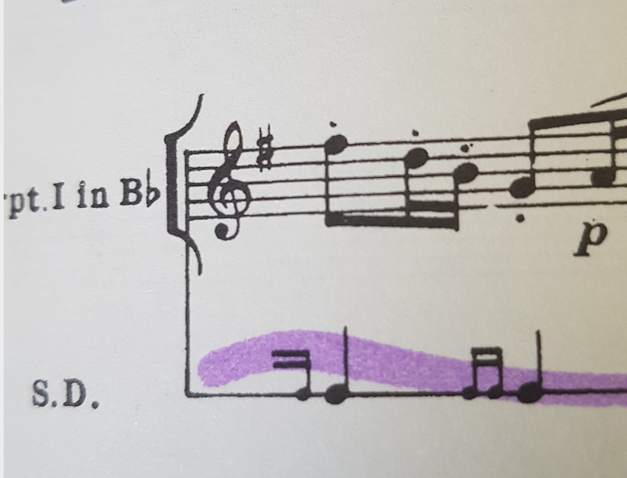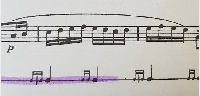 Je travailles sur une partition de Stravinsky. Dans un passage, il y a des appoggiatures à la caisse claire, étalées sur 2 mesures. (voir image 1)