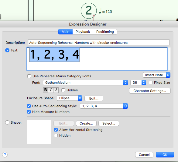 Je n'arrive pas à reproduire votre problème (testé dans Finale 2014d anglais Mac). Je change l'expression séquentielle de chiffres en GothamMedium 36 par ex., et je ne perds pas le cercle entourant l'expression.