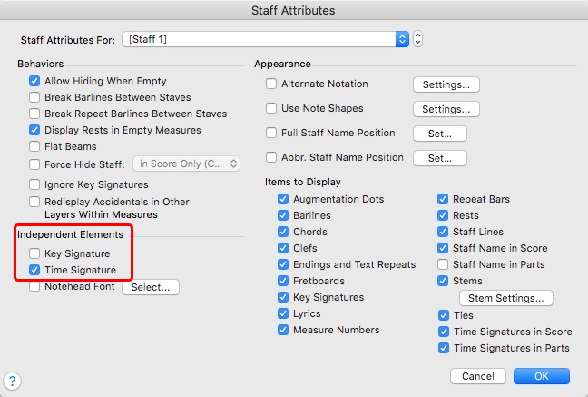 Il faut alors rendre indépendante cette portée en ce qui concerne l'indication de mesure. Cochez la case en bas à gauche dans la fenêtre, Eléments indépendants ► Indication de mesure.