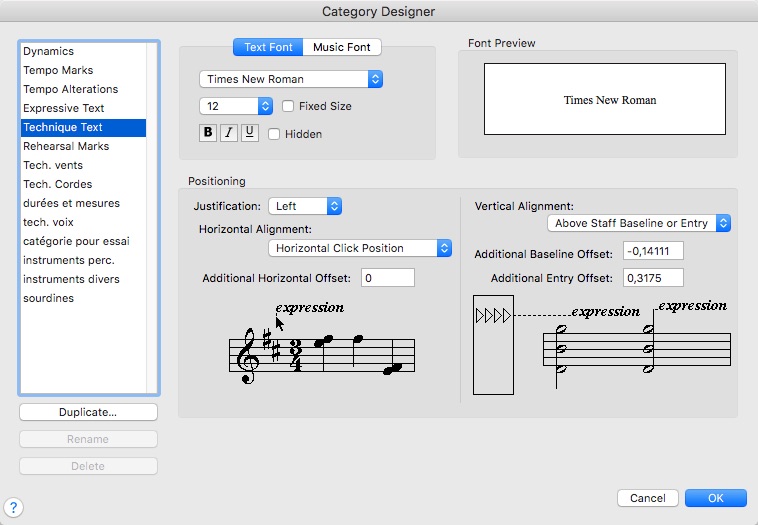 Entretemps, j'ai fait un test sur un nouveau fichier, en créant 2 nouvelles catégories d'expressions texte (par duplication d'une catégorie existante), et en modifiant ensuite, pour chacune, leur police dans les paramètres de la catégorie. L'original et les 2 duplicata ont donc des paramètres différents.
