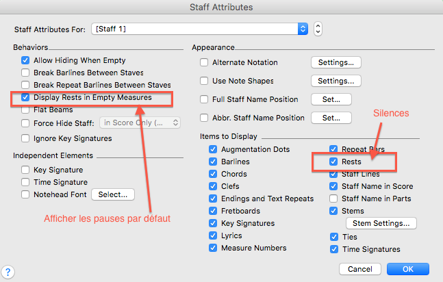 d'où les appellations "Pauses par défaut et "Silence", apparaissant dans cette fenêtre d'attributs de portée