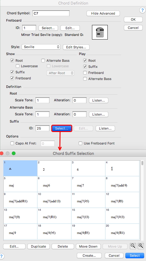Pour accéder à la bibliothèque des accords, il faut passer par la fenêtre de Définition d'accord / Chord Definition.