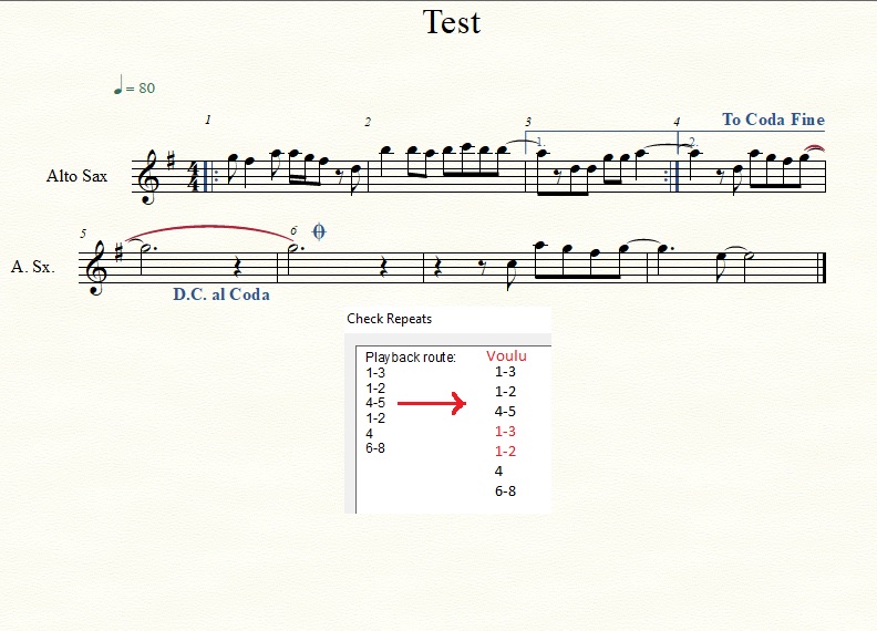 sur la mesure 1 du début, jusque là pas de soucis, sauf que au retour la reprise entre mesure 1 et 3 ne se fait pas, la lecture se fait en continu jusqu'à la fin de la mesure 4 où j'ai mis un saut vers la coda en mesure 6 , j'ai mis un fichier image