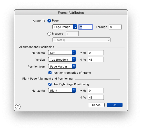 Quant à la fenêtre "Frame Attributes", tout ce que je pouvais y inscrire n'opérait pas si je partais du début de la partition. Pire! Les quelques numéros de pages demeurés corrects disparaissaient si je touchais à cette fenêtre, le dernier fichier fusionné (et corrompu) imposant son bug à tout ce qui le précédait. Par contre, le 4e fichier (en bon état) a tout rectifié lorsque je l'ai fusionné.