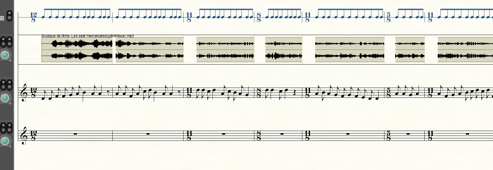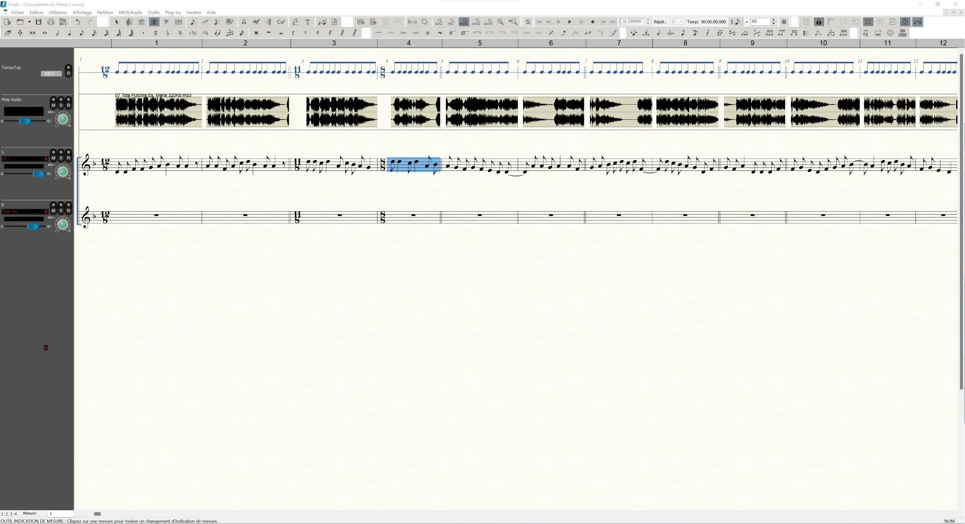 Le fichier Finale 26 original s'ouvrait avec de gros défauts, entre autre dans la lecture du fichier audio inséré (tonalité très augmentée, plusieurs tons, que je n'ai jamais pu corriger). Je suis donc en train de recrer la partition. Comme je suis l'audio (partition vocale de musique trad), presque chaque mesure est différente de la précédente pour caler la mesure sur chaque la phrase vocale.