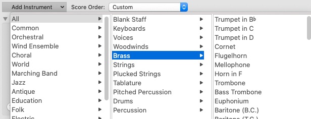 Voyez-vous les cuivres disponibles apparaître dans la colonne de droite quand vous sélectionnez leur famille dans la colonne centrale ?