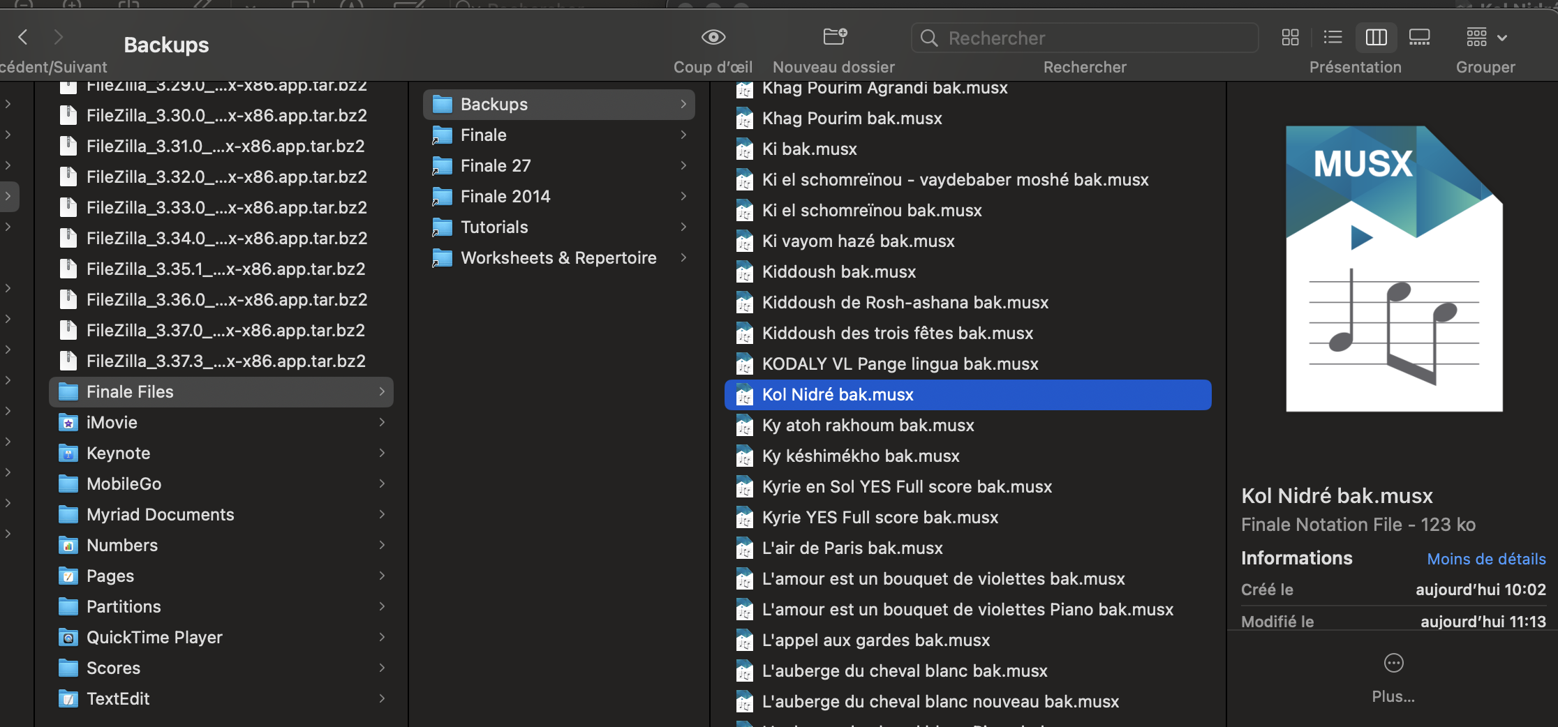 A midi, Finale se ferme brutalement. Je vais alors dans le dossier Finale Files/Backups/ et trouve la partition sauvegardée Kol Nidré.back.musx