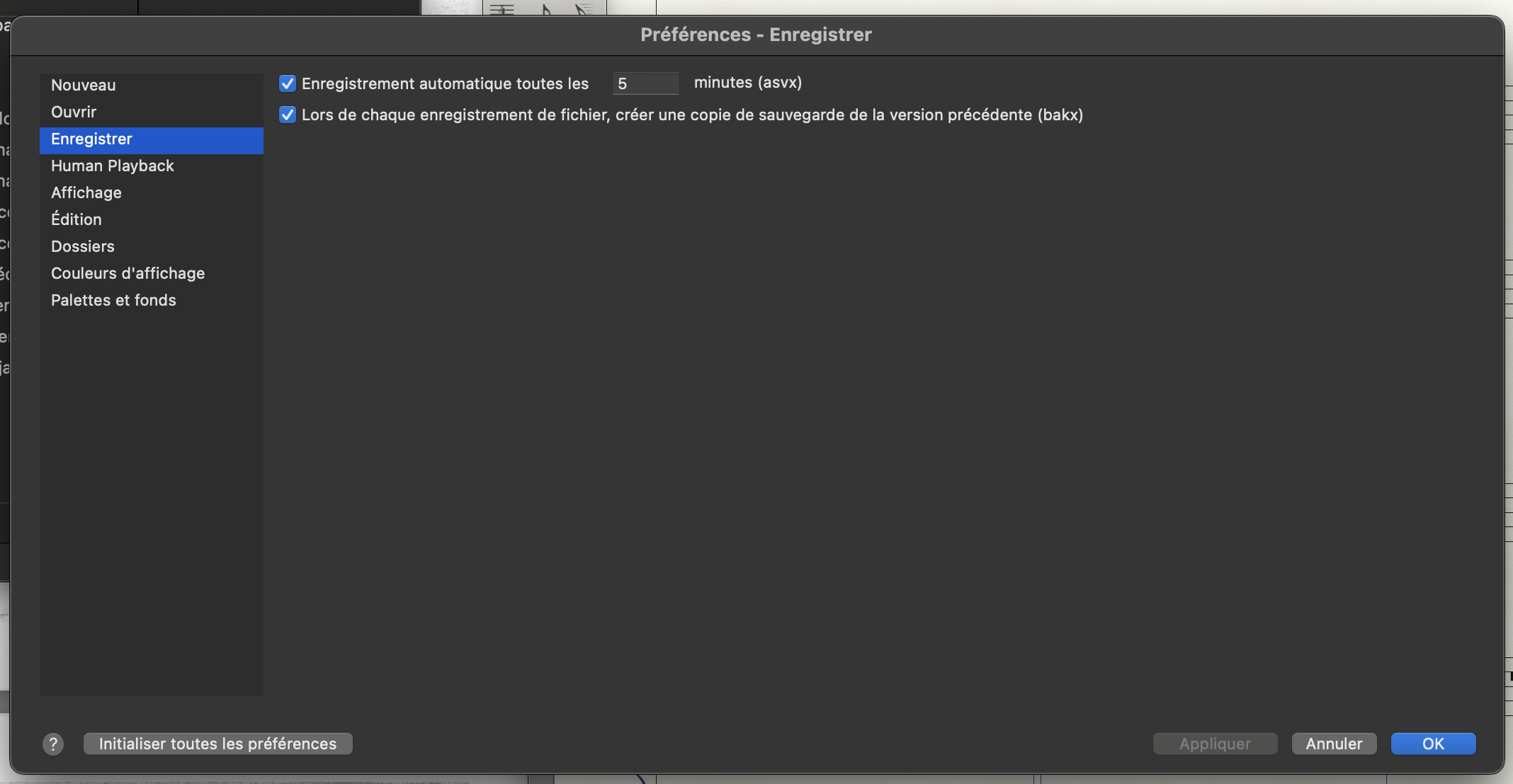Finale est configuré pour faire un enregistrement de sauvegarde toutes les 5 mn.