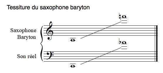 Pour la tessiture du baryton, à ma connaissance, la tessiture transposée est la même que celle des autres saxophones, à part le La grave qui est souvent disponible. L'aigu me paraît devoir être ceci :