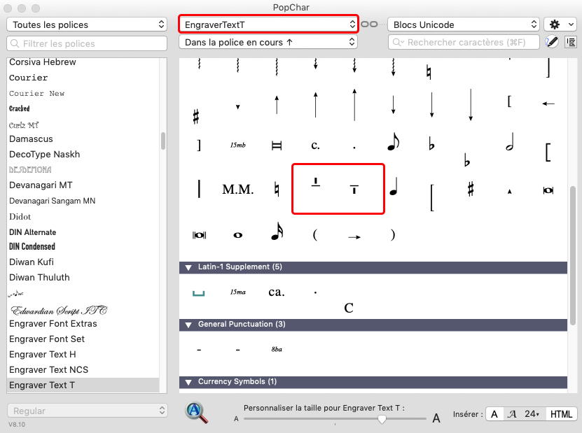Aussi, la police Engraver Text H (ou T) contient les symboles et les diagrammes pour les pédales de harpe.