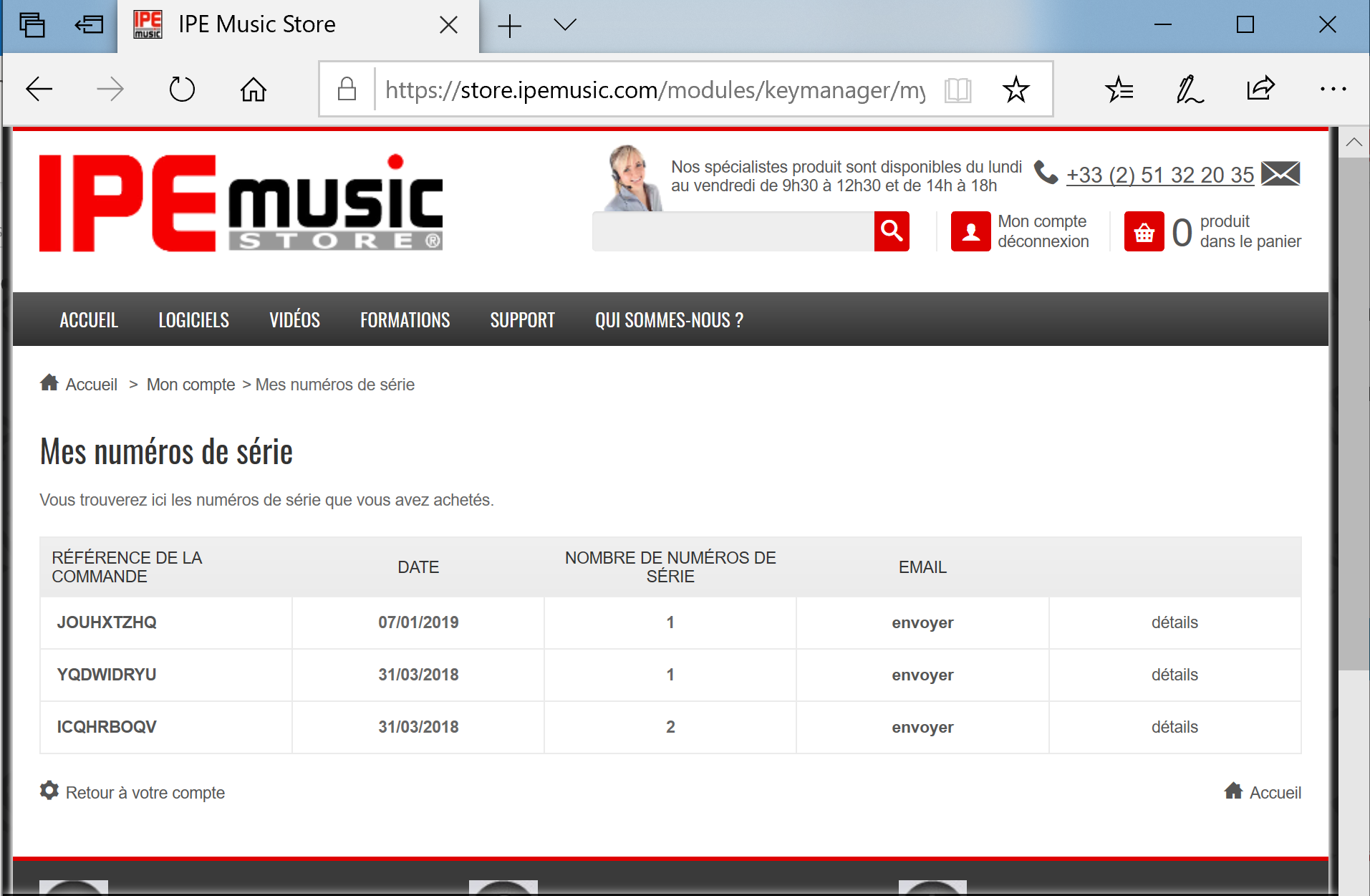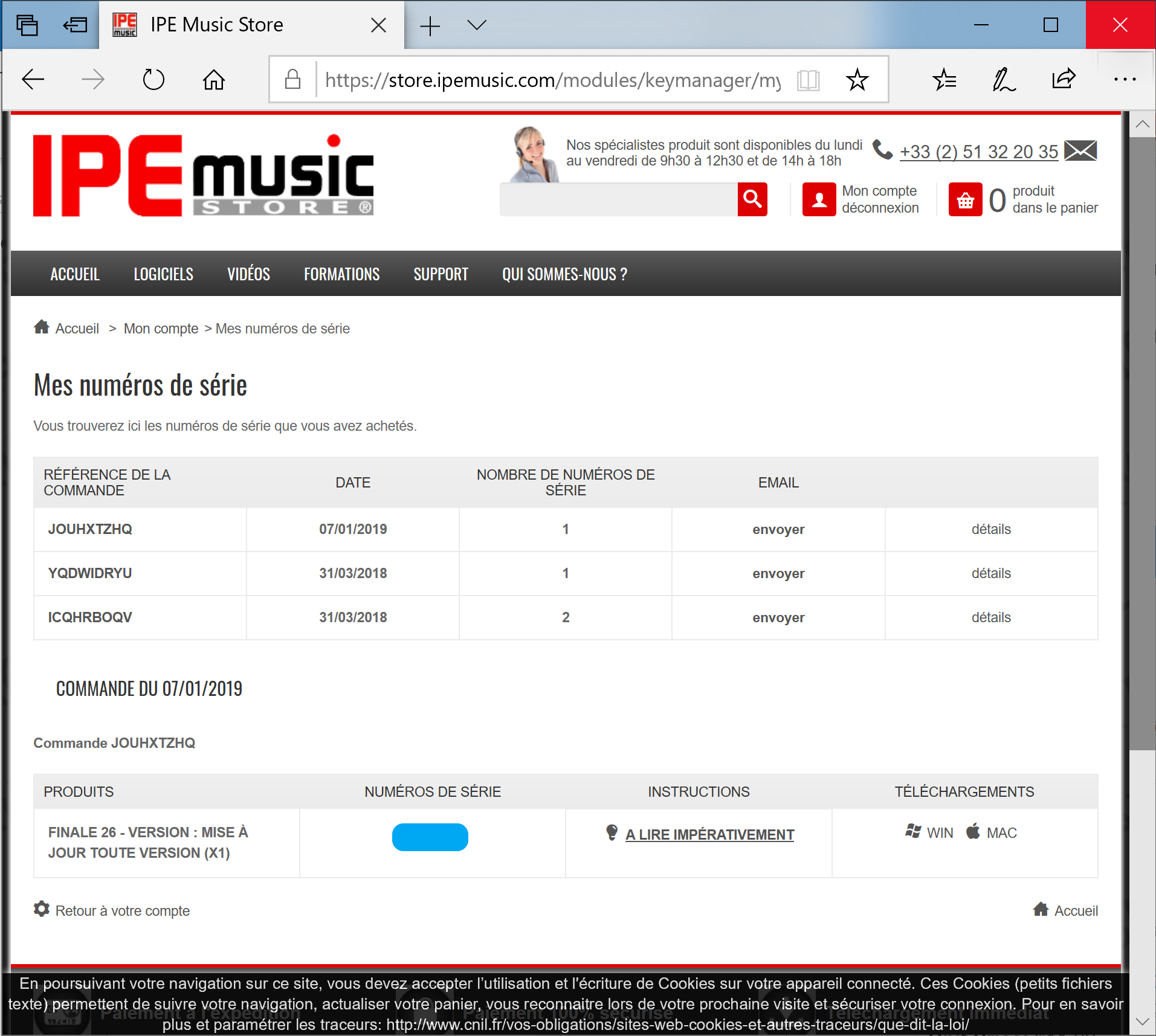 Après avoir passé l'étape du captcha, on télécharge en cliquant "Téléchargez" Si on n'a plus le mail avec son code de vérification, on peut le récupérer via son compte sur IPE Music. A l'ouverture de son compte, on clique sur "Mes numéros de série" (… suite car je suppose que les téléchargements sont limités)
