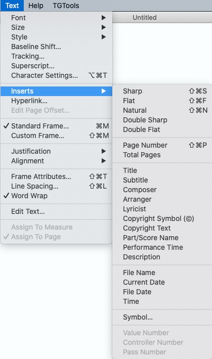 Merci Michel. Je ne trouve pas l'onglet "Insertions" dans le menu texte. Est-il présent sur Finale 26 ?