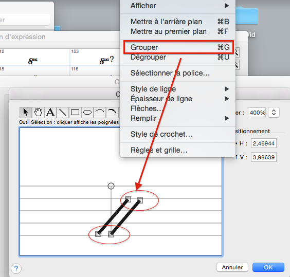 -Depuis l'Outil Sélection de cette fenêtre (La flèche oblique Gauche), affichez les poignées de ces lignes que vous venez de créer, puis regroupez les deux lignes obliques.