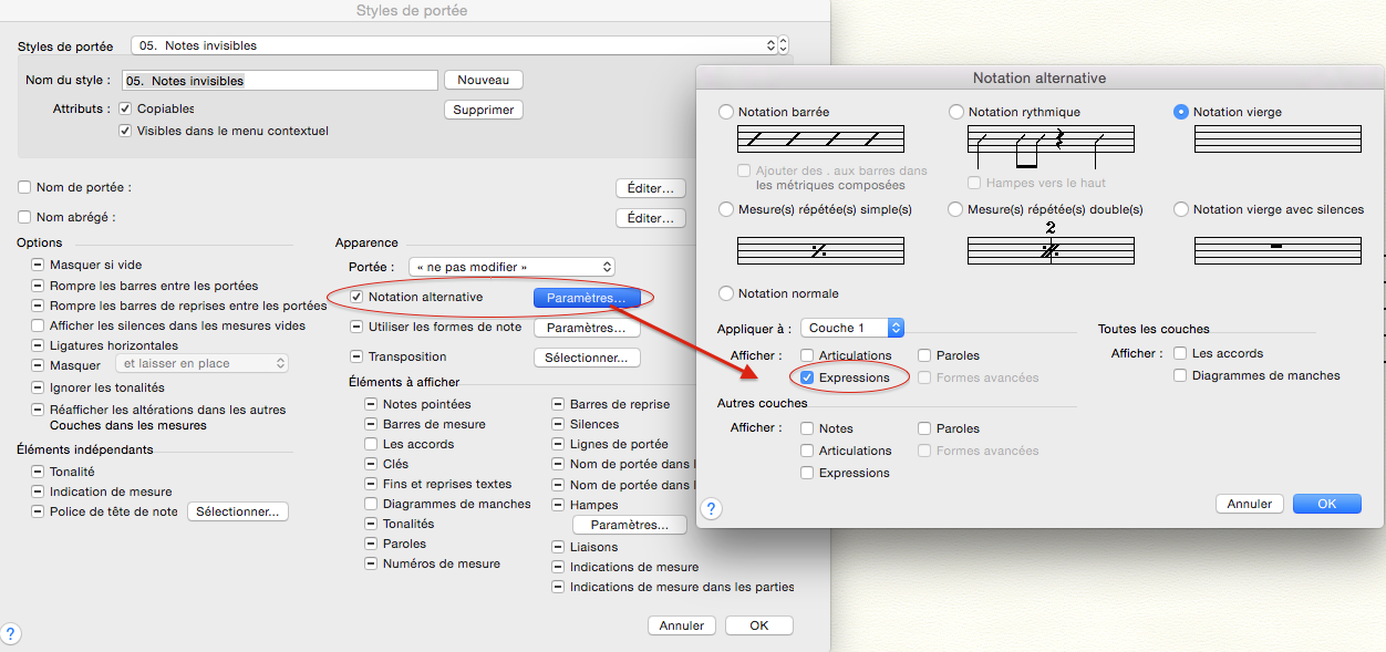 A ce stade il vous faudra demander à FINALE de faire figurer les Expressions pour ce Style de portée, pendant qu'il masque les notes :