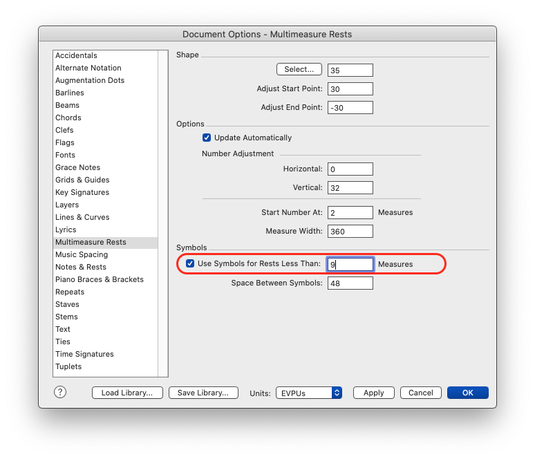 En principe, c'est dans les Options de réglage de la Partition ► Grandes Pauses / Document Options ► Multimeasure Rests que l'on peut sélectionner une autre forme que la ligne habituelle.