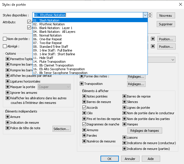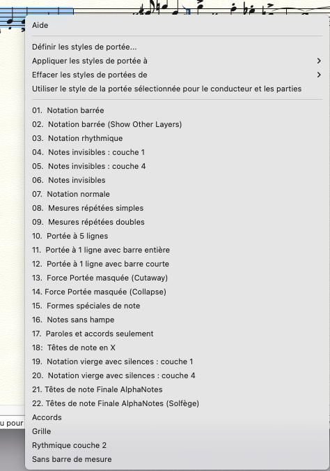 Les divers styles de portées sont présents ; ils apparaitront si vous les sélectionnez.
