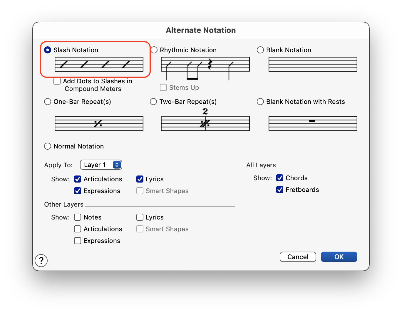 P.S. : le style de portée Notation barrée / Slash Notation peut être appliqué sur une mesure vide pour indiquer toutes les unités de temps, alors que la notation rythmique nécessite évidemment d'entrer des notes au préalable (et pas nécessairement sur les temps, cad plutôt pour indiquer des figures rythmiques).