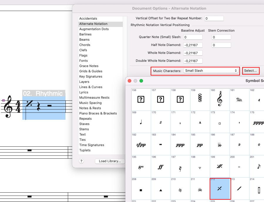 Si vous sélectionnez la petite barre / Small Slash et faites apparaître son symbole, vous verrez que c'est le symbole de répétition simple de mesure qui lui est affecté (212 chez moi en Maestro) au lieu de 243 (petite barre / Small Slash). C'est ce symbole qui s'affiche en guise de tête de note dans la notation rythmique.