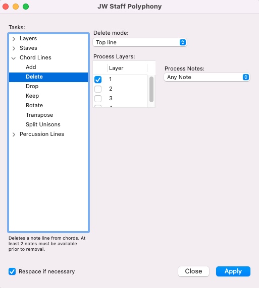 Le plus simple serait d'utiliser le plug-in (à installer) JW Staff Polyphony ► Chord Lines (sélectionner Top ou Bottom Line) ► Delete (ou Keep à l'inverse).