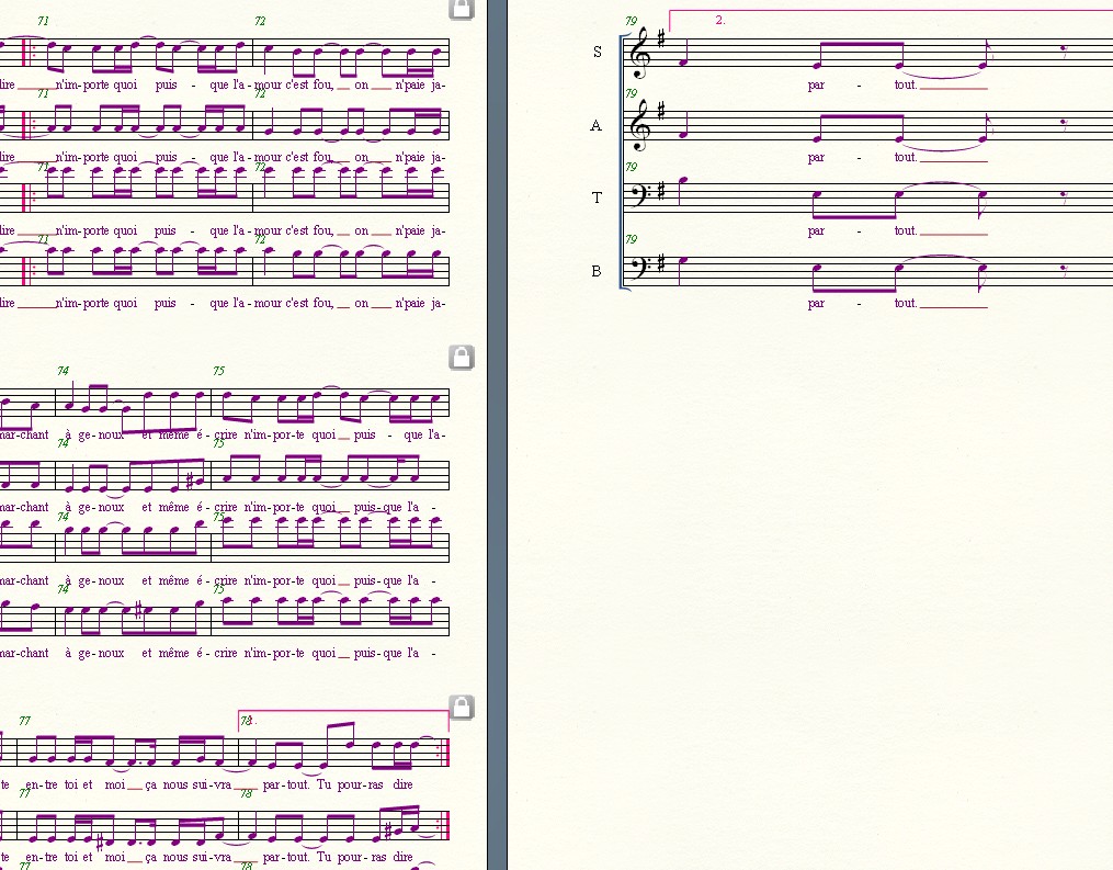 Merci pour la réponse mais les articles ne m'ont pas aaidée et je suis vraiment ennuyée, j'ai une douzaine d'erreurs à corriger dans la saisie avant d'exporter en audio ! Je joins une copie du début de la partition papier, le problème se pose déjà mesure 12 pour les hommes (pour le 2ème couplet) Il y ...