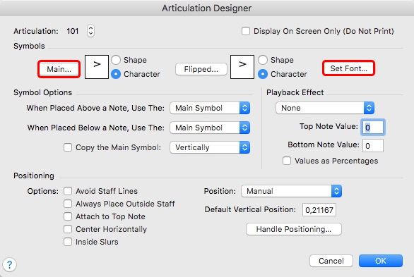 Vous pouvez tout simplement utiliser l' "Articulation Designer" (vous créez temporairement une articulation dont vous définissez la police, puis vous cliquez sur "Main").
