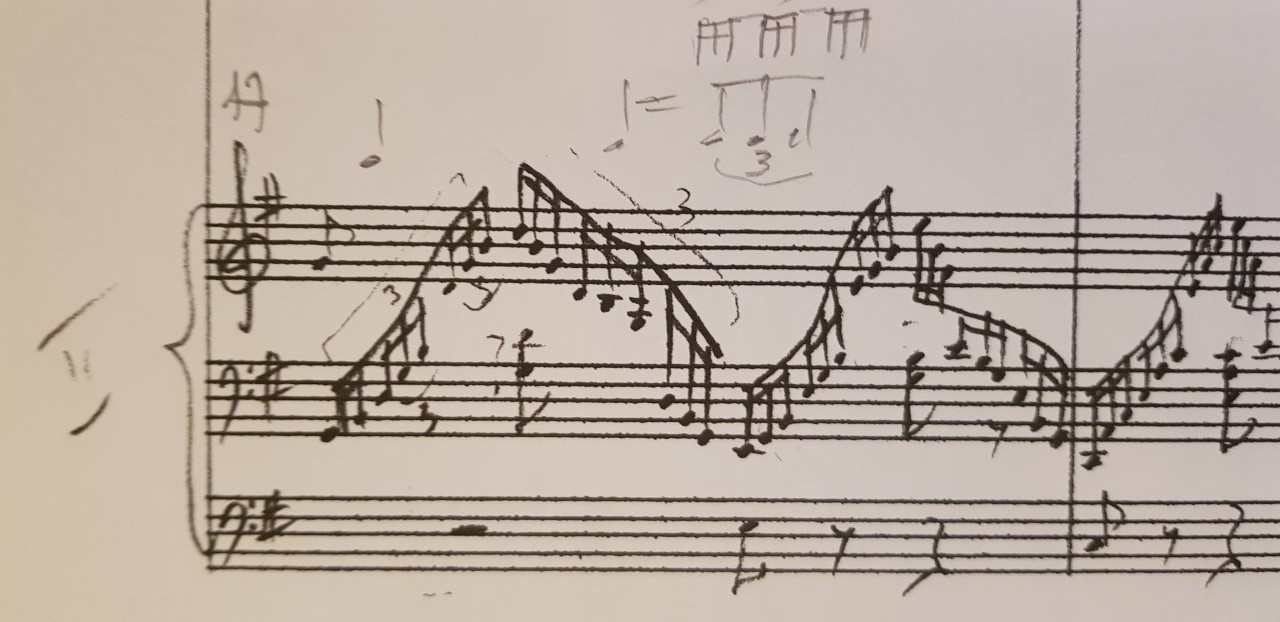 Je me heurte au problème suivant depuis plusieurs heures dans cette partie à 4/4, voir photo jointe ; Je ne sais pas comment réaliser le premier groupe composé de 2 double-croches en triolet - valant 3 double-croches en triolet - pour qu'associé au 2 triolets de double consécutifs, l'ensemble fasse un temps. Les 3 autres groupes de la mesure sont standards : 9 double-croches pour une noire, aucun problème...