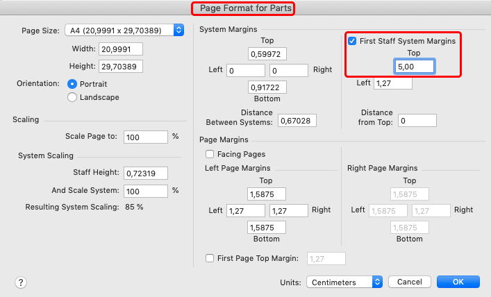 Dans le menu Partition ► Format de page ► Parties, en haut tout à droite, vous pouvez définir une marge du haut plus grande pour le premier système.