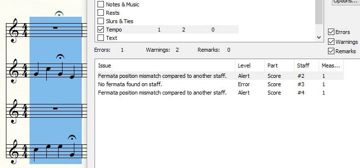 On choisit les paramètres à vérifier (Notes & Music, Rests, Slurs & Ties, Tempo, Text,...), et on lance la routine de test, à la recherche d'erreurs ou choses à signaler (Errors, Warnings, Remarks).