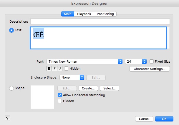 Encore une fois, force est de constater les grosses lacunes de Finale en traitement de texte là où il suffit d'utiliser la police Maestro times en "inserstion de caractères spéciaux" dans excel ou word ou bien d'autres logiciels encore pour arriver rapidement au résultat souhaité. Mais à priori Makemusic tout en étant conscient du problème, tant il leur a été signalé, tant il est récurent, reste sourd à nos doléances...