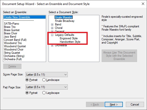 Si, lors de la création d'un nouveau document dans Finale 27, vous ne souhaitez pas utiliser la nouvelle version SMuFL de la police Maestro, qui porte le nom de Finale Maestro, vous pouvez choisir la police "classique" Maestro (non SMuFL) dans le créateur de partition / Document Setup Wizard en cochant la case "Legacy Defaults".