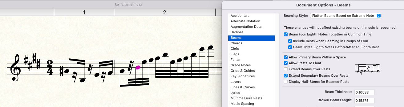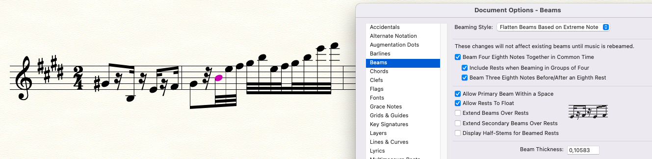 C'est ce que j'ai fait en choisissant dans Document options l'occurence la plus fréquente et en faisant séparément "la pièce unique". En revanche j'ai utilisé l'outil "Secondary beam angle" avec lequel j'ai caché les segments double et triple sous la barre de la croche et je vais m'en satisfaire...