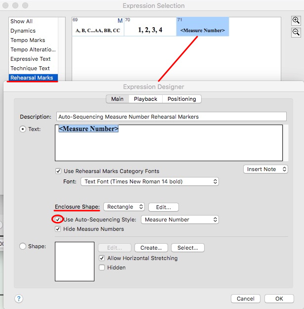 2) Dans l'outil expression, vous pouvez créer une séquence "automatique", encadrée si vous le voulez, placer ces expressions dans la partition aux endroits souhaités, et laisser ou masquer les numéros de mesure créés par l'outil mesure.