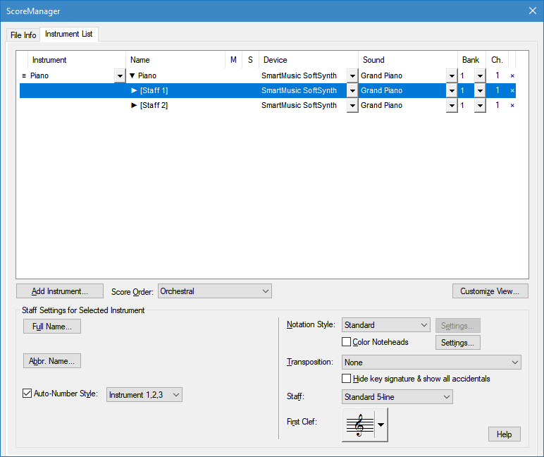 C'est tout simplement que le piano est un instrument à portées multiples. Il faut donc cliquer sur le petit triangle à gauche de Piano (colonne "Name") et les portées apparaissent (on peut donc les sélectionner).
