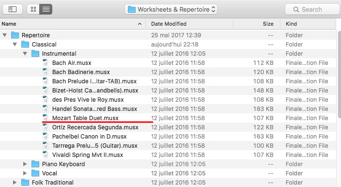 Dans le dossier Répertoire fourni avec Finale, cette pièce de Mozart ("Table Duet") est disponible ! Mais je n'ai plus Finale 2005 et ignore si elle était déjà disponible. Dans les versions récentes, c'est accessible sous Fichier ► Ouvrir Worksheets & Repertoire. Dans votre version, cherchez sur votre disque dur. C'est dans un sous-dossier Classique ► Instrumental. Espérons que cela se trouvait déjà dans Finale 2005.