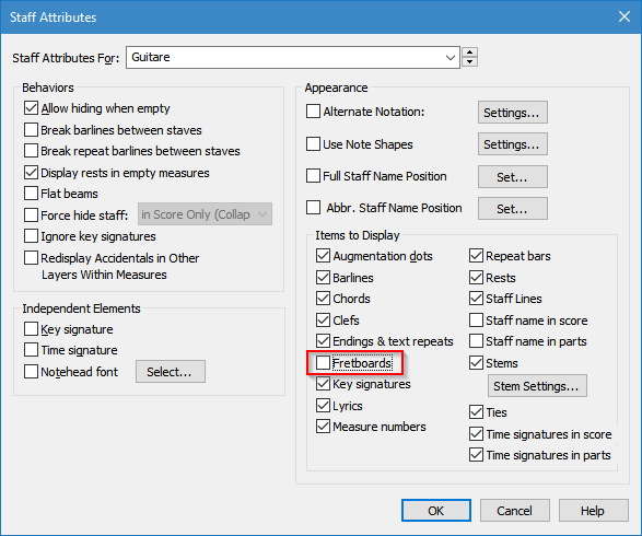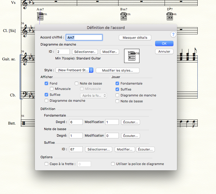 Sinon il existe une autre méthode, c'est de décocher "Fretboards" dans les attributs des portées des instruments non concernés. Cela cachera les diagrammes sur toute la portée.