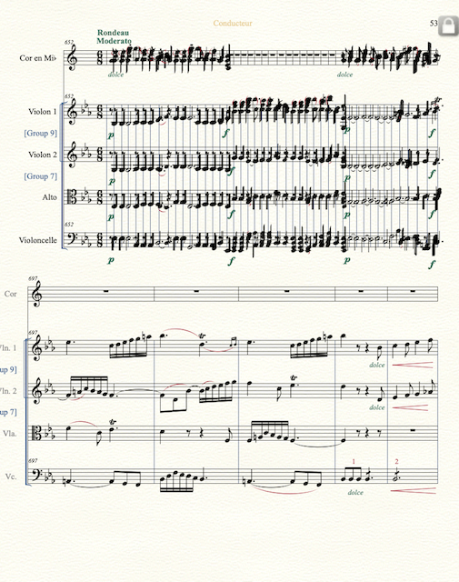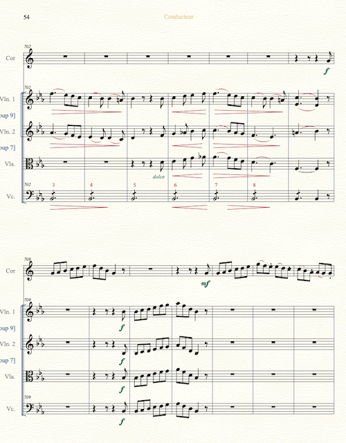Dans le score, j'avais globalement terminé la mise en page, mais hier j'ai décidé d'espacer un peut plus les derniers systèmes du 2e mouvement. Les mesures déplacées se sont donc ramassées dans le premier système du 3e mouvement.