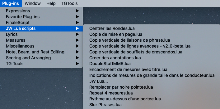 Je suis récemment passé à Finale 26 (26.2.1) sur Mac Mojave. J'ai réinstallé les scripts JW Lua (ceux de Finale 25) via le plug-in (bouton New). J'en vois la liste dans le plug-in JW Lua ainsi que dans mon menu plug-in (sous dossier JW Lua Scripts), mais je reçois un message d'erreur. Finale ne trouve pas les scripts.