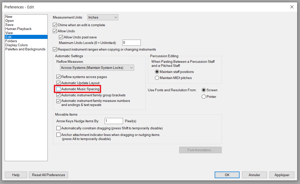 Pour ceci, il faut aller dans les préférences du Menu Edit, puis aller dans le menu edit et décocher "automatic music spacing"