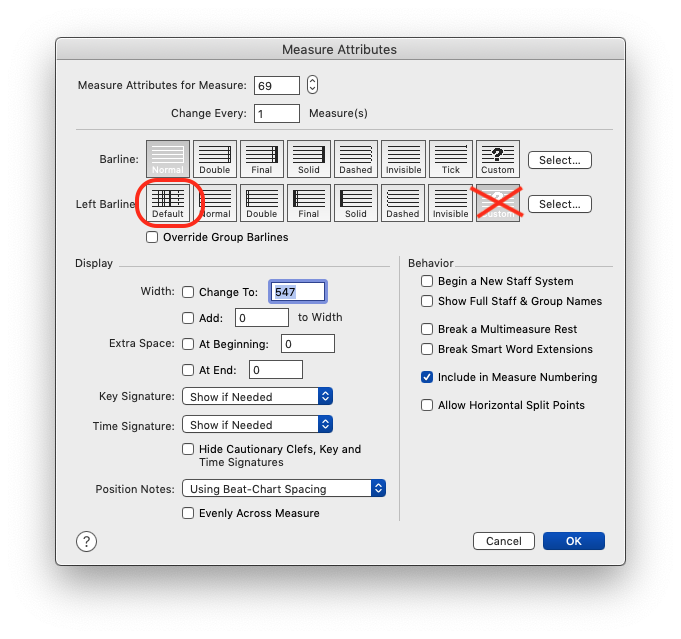 Les barres : de la mes. 69 à la fin : les sélectionner avec l'outil Mesure > Éditer les attributs de mesures > choisir dans la 2e rangée de mesures "Défaut"