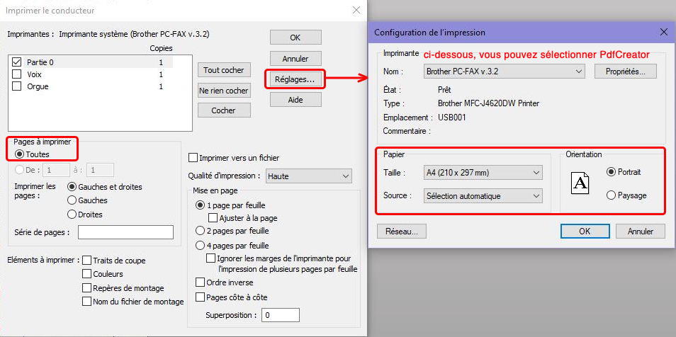 Il est préférable de passer par les parties liées, qui sont intégrées au fichier du conducteur. De ce fichier, on peut imprimer ou exporter en pdf le conducteur et toutes les parties, comme expliqué dans une FAQ.
