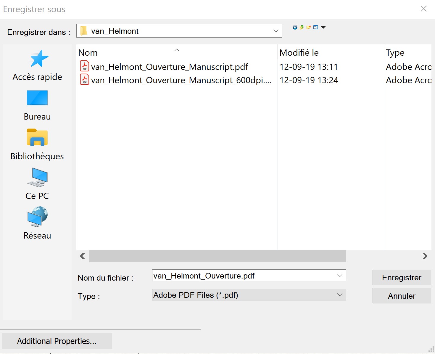 Les options (moins nombreuses que sur MAC semble t'il) s'obtiennent en cliquant sur "additional properties" (Si on veut plus d'options pour le fichier PDF, il suffit d'utiliser une imprimante virtuelle comme celle qu'offre directement Windows avec Microsoft Print To PDF)