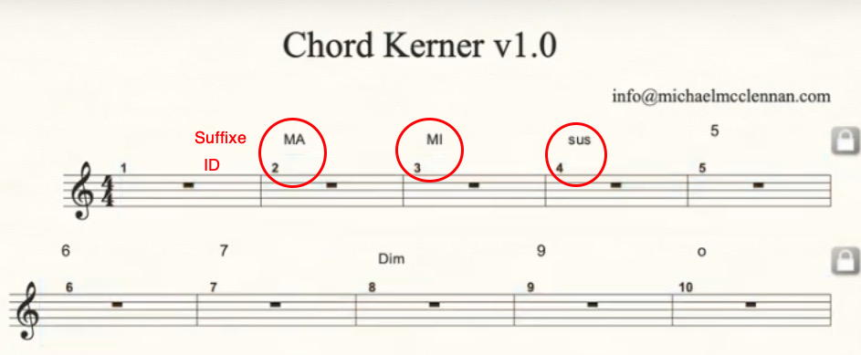 P.S.: le numéro du suffixe correspond à celui de la mesure dans laquelle il apparaît. Ces numéros de mesures sont affichés au-dessus de chacune des mesures du document créé, ce qui facilite l'identification du suffixe en prévision de son édition (ce numéro est à entrer en haut de la fenêtre de Chord Kerner, à côté de Chord ID).