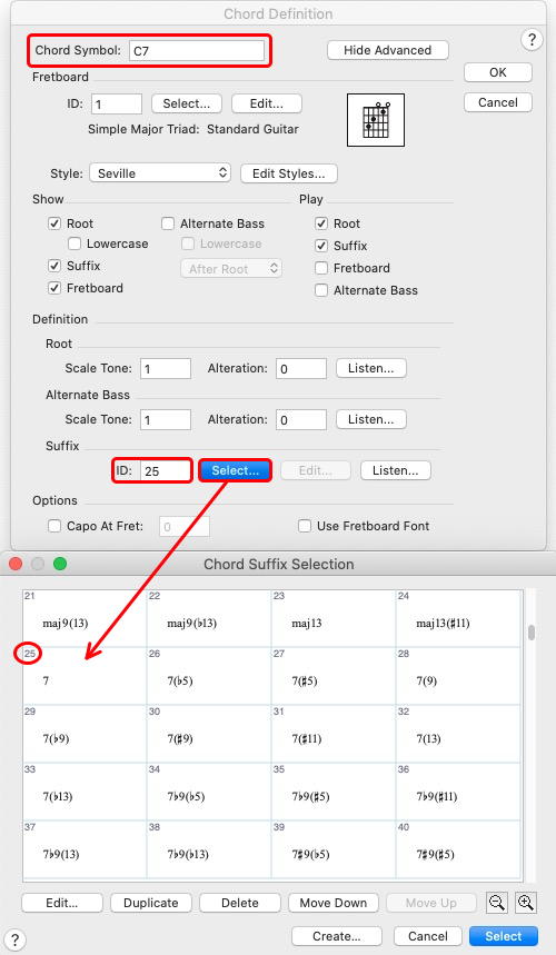 Pour trouver ce numéro d'ordre / ID, sélectionnez l'outil accord et faites un clic droit sur la poignée de l'accord dans la partition pour accéder à la fenêtre de Définition de l'accord / Edit Chord Definition.