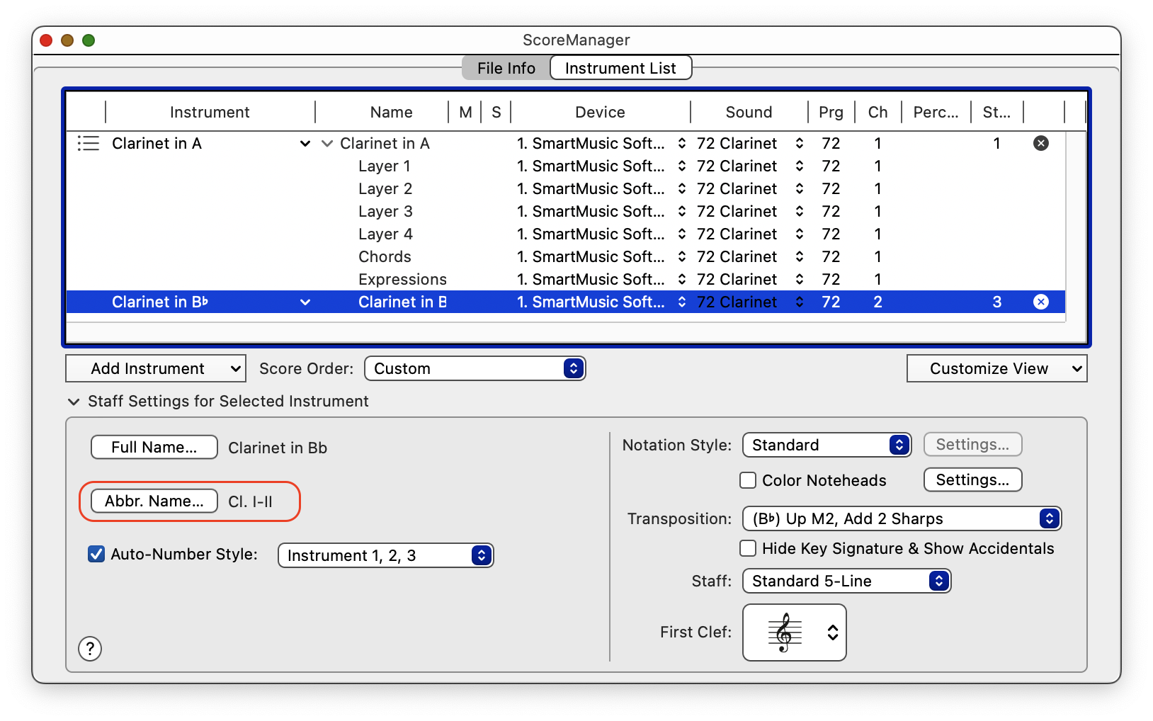 Autre solution : lorsqu'il y a un changement d'instrument, on le retrouve dans le Score Manager : cliquer sur la petite flèche dans la colonne "Noms" de la portée de clarinette en la, et le nouvel instrument apparaît. On peut alors modifier son nom abrégé