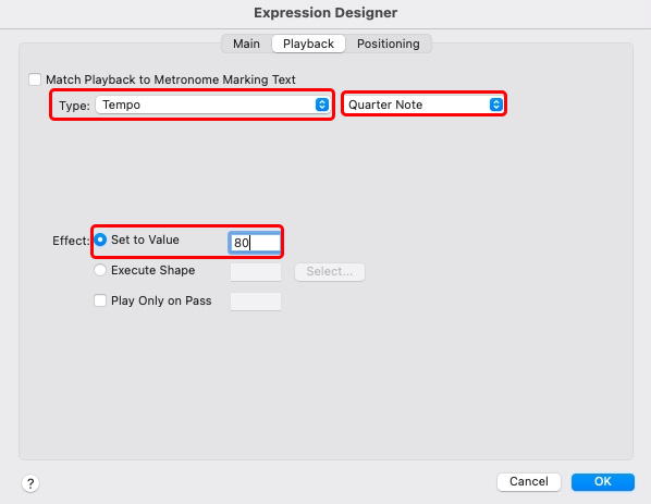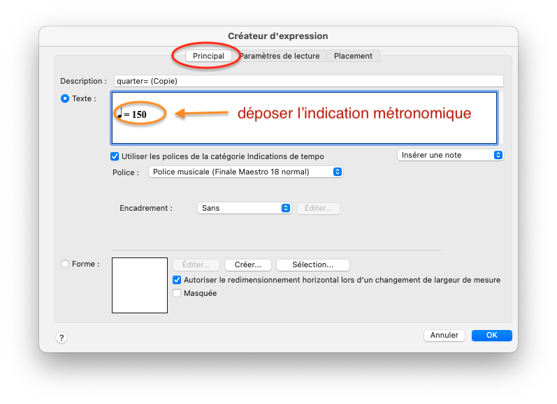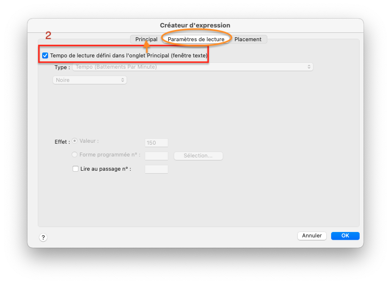 ...cette expression peut contenir une instruction de Type ► Tempo (définie via l'onglet lecture / Playback), cad un tempo noire à 80 dans notre exemple, cad 2/3 de la durée de la noire pointée précédente.