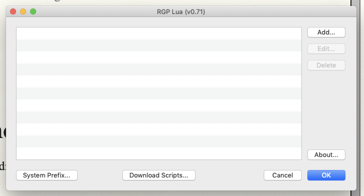 En résumé, cliquez sur Add, puis Select File, puis localisez le script, placé au préalable dans le sous-dossier "RGP lua & Scripts" (où se trouve le plug-in RGP Lua).
