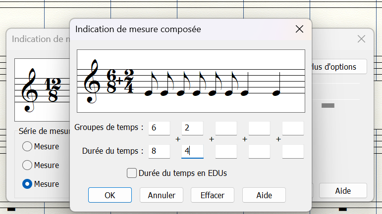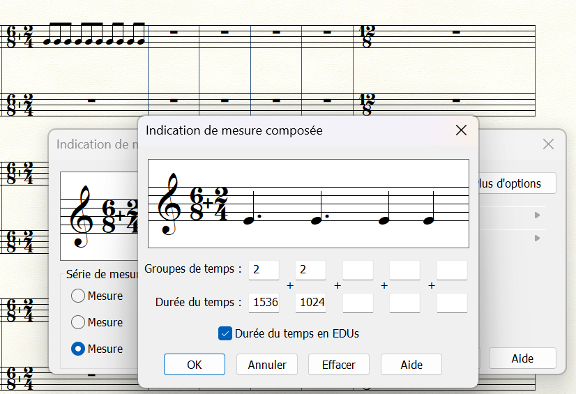 Si vous souhaitez, ce que j'imagine, que les croches de votre mesure soient reliées en 3-3-2-2, mieux vaut taper ceci, en cochant "Durée de temps en EDUs".