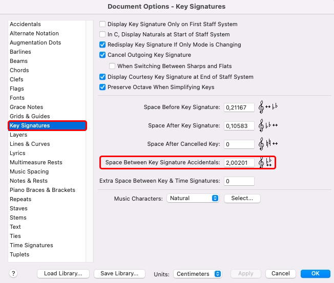 Au même endroit, le premier réglage (concernant l'espace avant l'armure) peut déplacer vers la droite la première des altérations, et l'autre réglage définira leur espacement entre eux par la suite.
